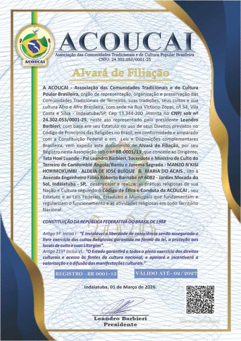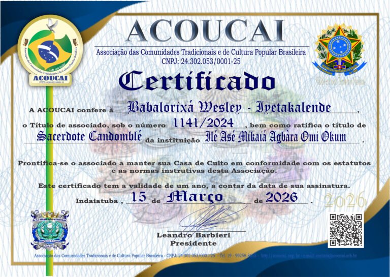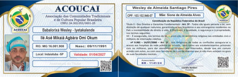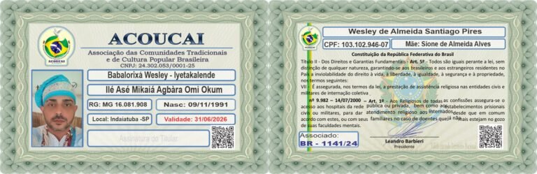 Histórico: Me chamo Wesley de Almeida, nascido em Bocaiúva -MG . Criado em raízes do candomblé / umbanda, por avós paternos, iniciado por Luiz Antônio Spice, filho de Ogum , cujo esse carrega djina Odécirajô. Faço presente no candomblé desde os 8 anos de idade, iniciado aos 14 anos no Terreiro Senzala Lembá Ogum Megê 7 Espadas . Tomando assim a primeira obrigação de Odum Kini (1ano) em meados de 2007.Seguindo todos os preceitos , tomando em seguida obrigação de(Odum Itá) 3 anos , logo após 10/07/2014, tomando (Odum Ejé) de 7 anos ,me tornando Egbomi e rececebendo o meu Deká. Meados de setembro 2021, realizando meu (Odum Iká) de 14 anos . Me tornando assim Chefe de Congá!