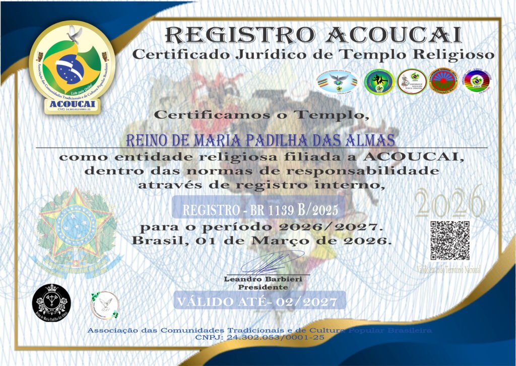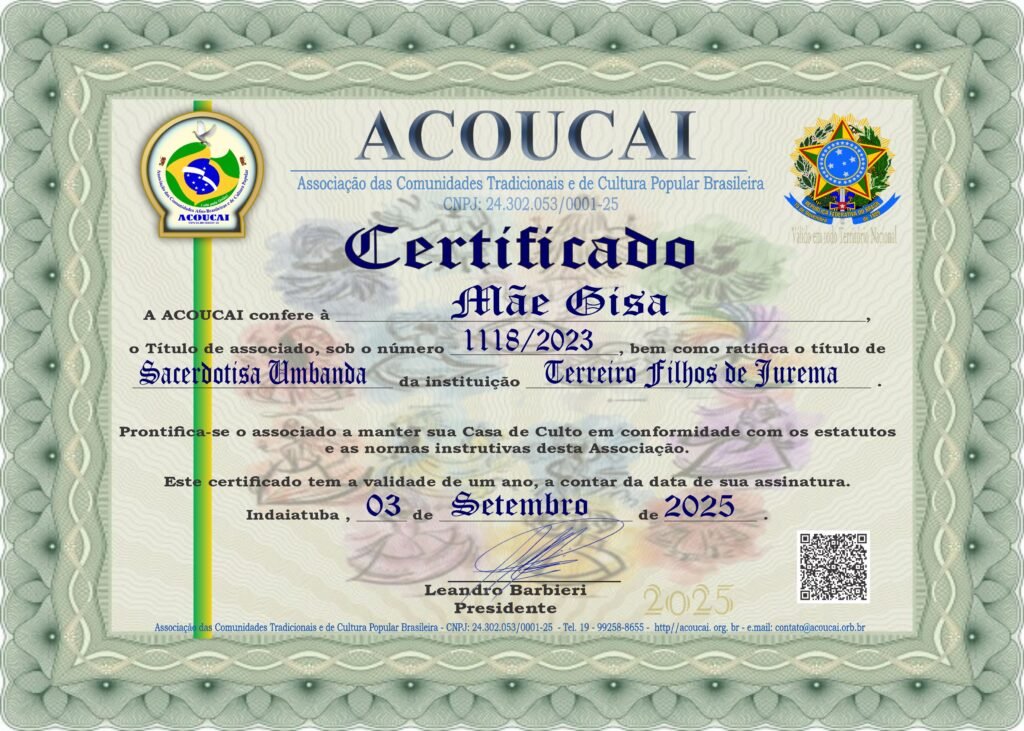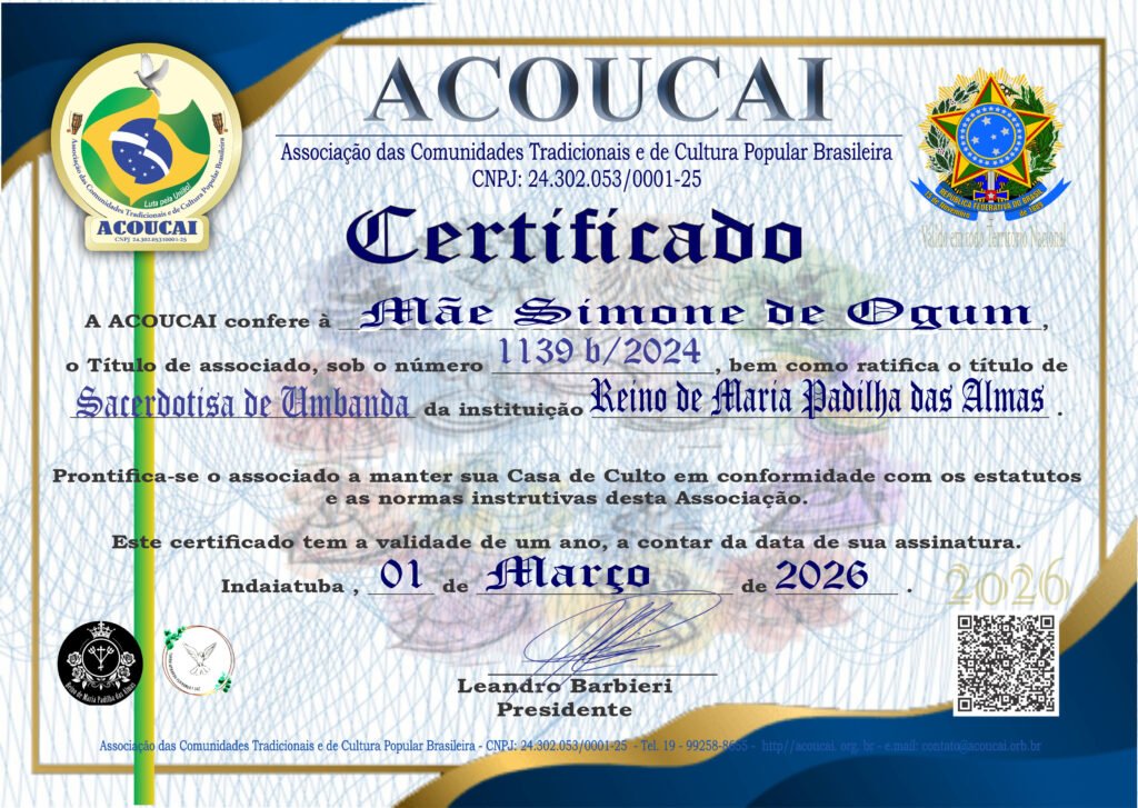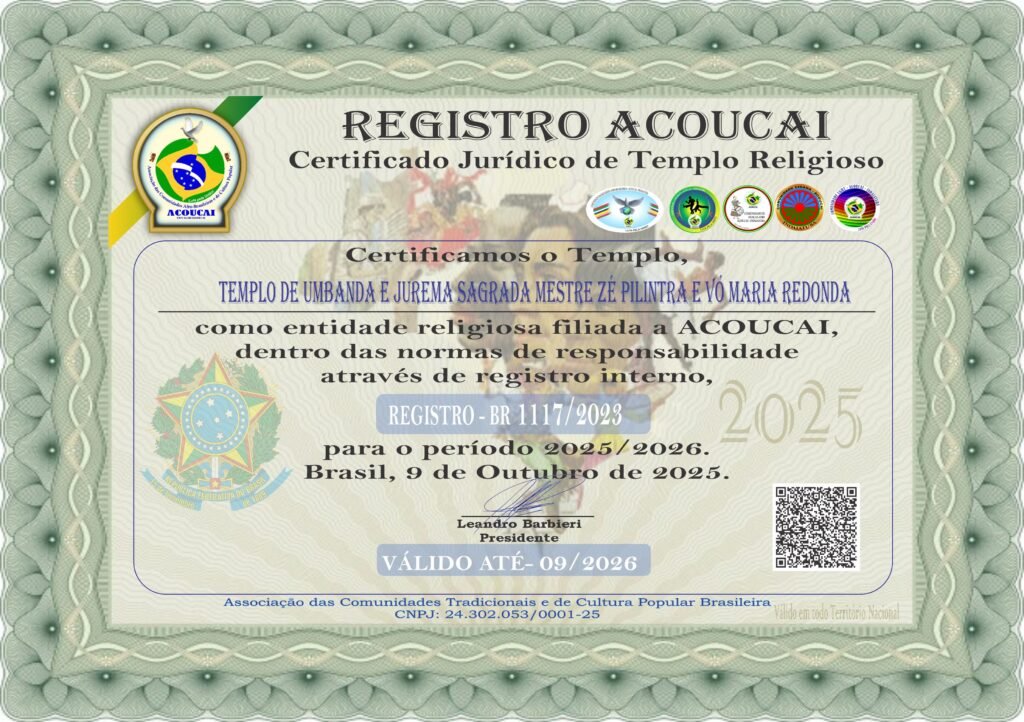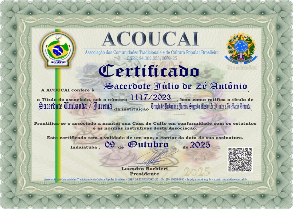 Dirigente das Casas de Culto: Templo de Umbanda e Jurema Sagrada Mestre Zé Pilintra e Vó Maria Redonda